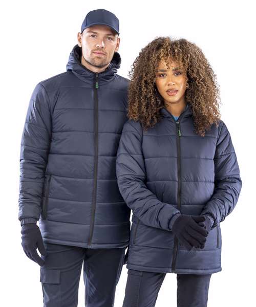 Showerproof. Breathable. Windproof. Padded and bound elasticated hood. Zip-through collar with zip pull. Contemporary quilted design. Soft-feel poly wadding. Elasticated cuff. Zipped pockets. Inner storm flap. Longer length. Inside pocket. Straight hem. Hang loop. Recycled fabric.