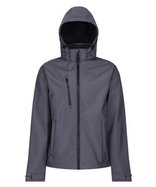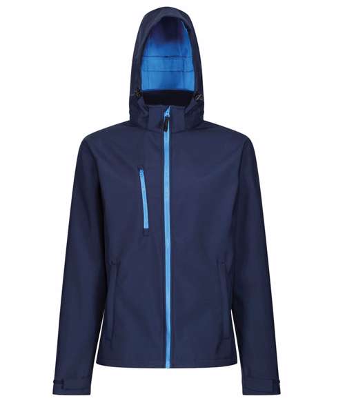 Warm-backed woven softshell XPT waterproof and breathable 3 layer membrane fabric. Fully printable outer fabric, with wind resistant inner membrane. Detachable softshell fabric hood, adjustable shock cord at face and cuff adjusters. 2 zipped lower pockets and 1 zipped chest pocket. .