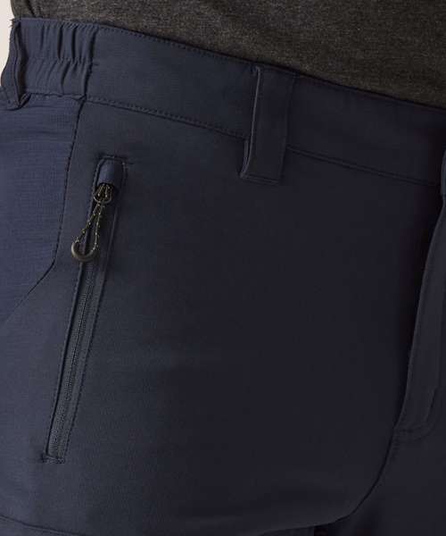 Woven stretch fabric with a DWR (Durable water-repellent) finish. Ripstop stretch fabric to knee, seat panels and re-enforcement at the hem. Part elasticated waist and high back waistband. Multi pocketed with front and rear zipped pockets.