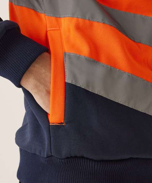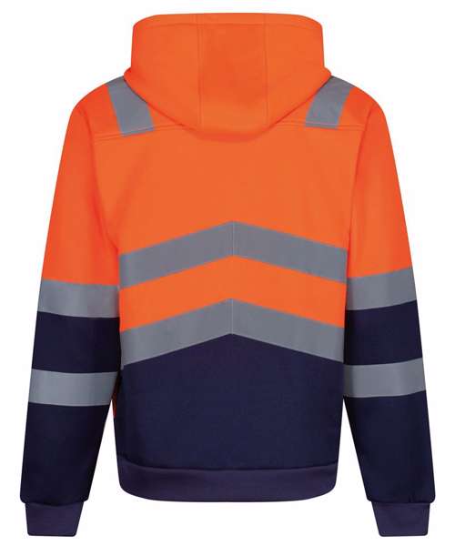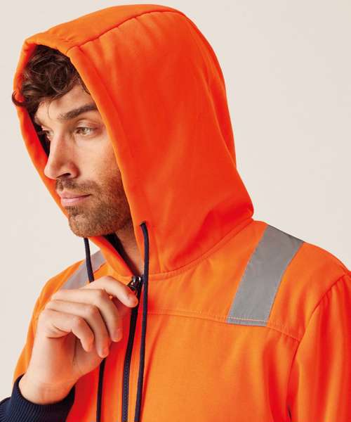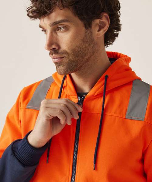 Stay visible in this hi-vis hoodie, made with a polycotton blend for comfort and durability. Pop on the hood for extra protection. Angled hi-vis chevrons show which way you’re facing in low light. Conforms to EN ISO 20471:2013 +A1:2016 Class 2.