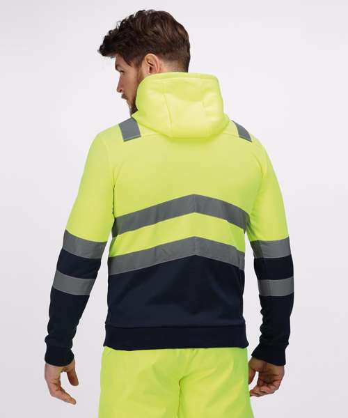 Stay visible in this hi-vis hoodie, made with a polycotton blend for comfort and durability. Pop on the hood for extra protection. Angled hi-vis chevrons show which way you’re facing in low light. Rest your hands in the kangaroo pocket. Conforms to EN ISO 20471:2013 +A1:2016 Class 2.