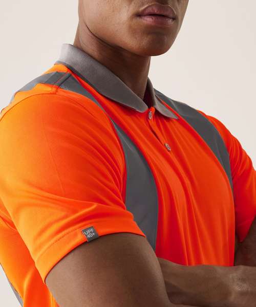 100% polyester, wicking, soft-touch micro mesh – 150gsm. Certified to EN ISO 20471:2013 A1:2016 Class 2. Orange colourway also conforms to RIS-3279-TOM. Gap in reflective tape at side seams improves comfort and stretch. Fabric provides UPF 40+ protection. Side vent detail. Made with recycled content. Two-button placket. Ribbed collar.