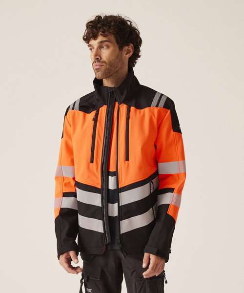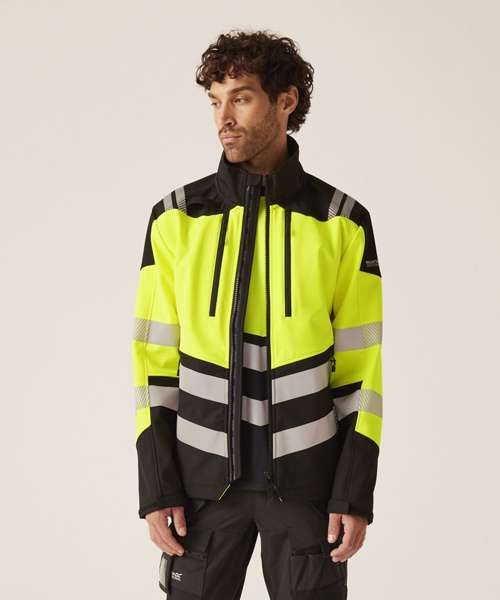 96% Polyester, 4% spandex 3L softshell with warm grid fleece backing and water-repellent finish. Certified EN ISO 20471:2013 +A1:2016 Class 2. Detachable hood with adjusters. Heat-applied reflective tape, with segmented tape on strategic panels for additional comfort. Six pockets. One radio loop. Inner stormguard. ID reflection – angled chevrons identify which way you are facing. Made with recycled content.