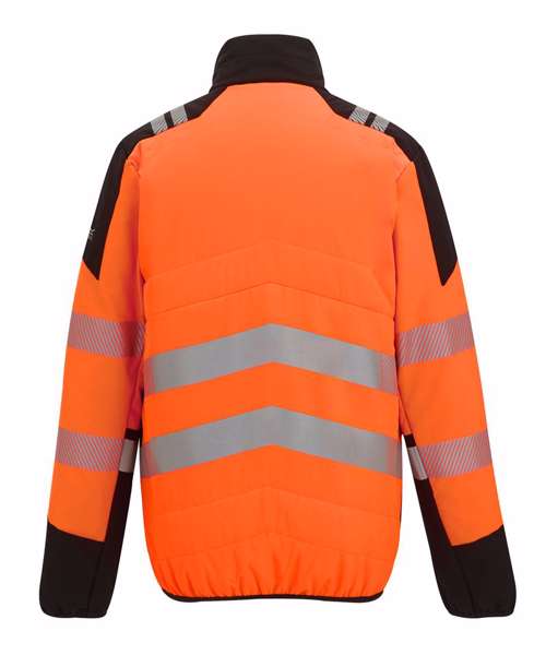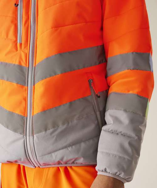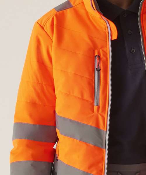 Lightweight four-way stretch fabric with a durable water-repellent finish. Warmloft insulation, 160gsm. Certified EN ISO 20471:2013 A1:2016 Class 2. Orange colourway is also certified to RIS-3279-TOM. One zipped chest pocket and two lower zipped pockets. Internal pocket. Fleece-lined collar. Stretch binding to armholes. Concealed inner zip for embroidery access. Darker contrast panels, ideal for dirty environments.