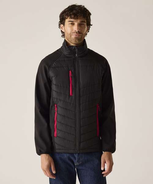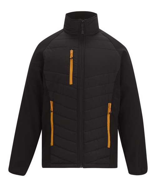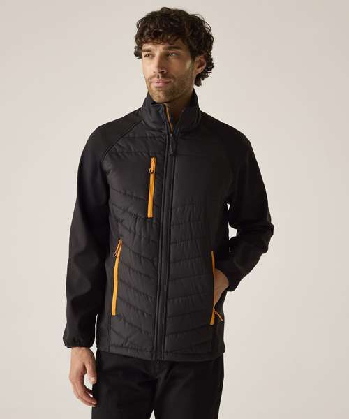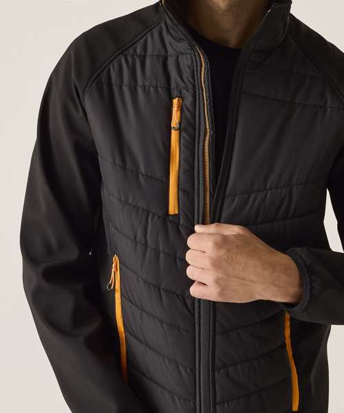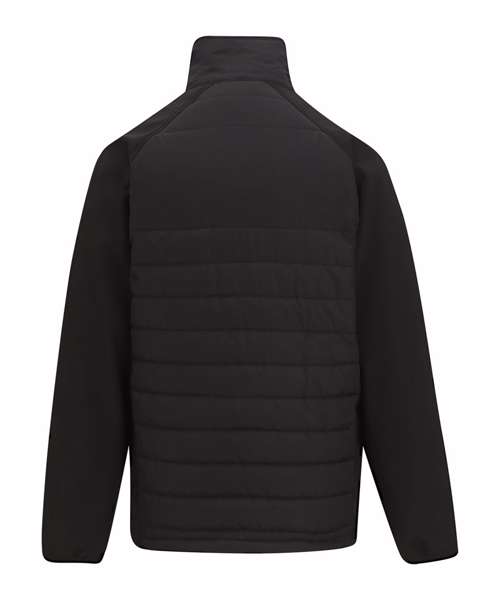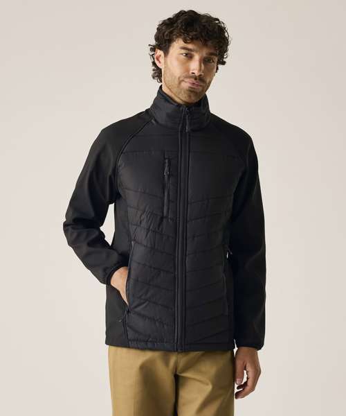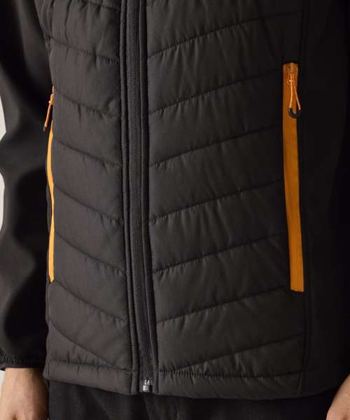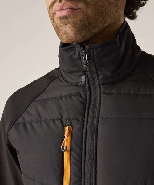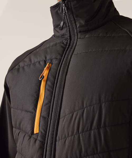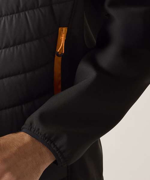 Water-repellent polyester micro poplin. Mechanical stretch softshell on sleeves and side panels for improved fit and freedom of movement. One zipped chest pocket and two lower zipped pockets. Stretch binding to cuffs and hem. Concealed zip entrance in lining for embroidery access. Chest area space for decoration. No external logo branding. Contains recycled polyester.