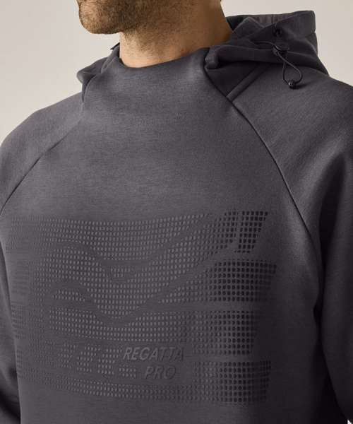 65% Polyester, 35% cotton, brushed back, soft-touch fabric. Graphic print detail. Ribbed cuffs and hem. Grown-on hood with adjusters. Kangaroo pocket to the front.