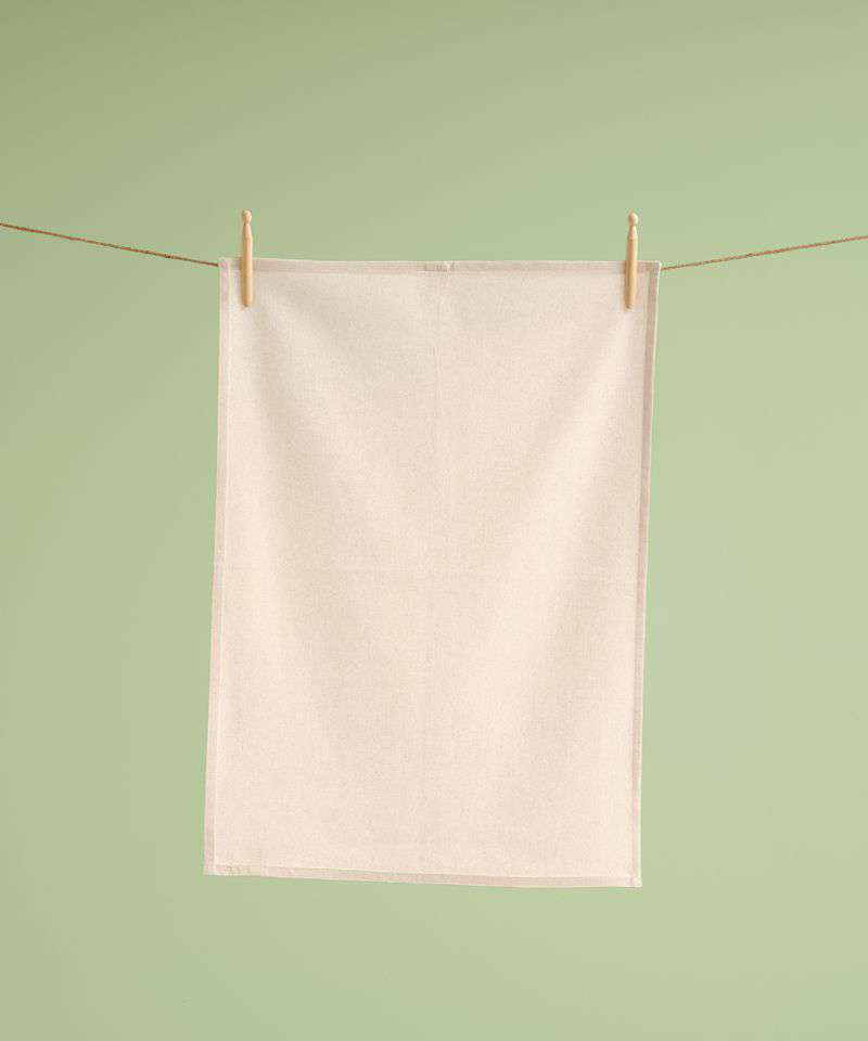 Tea Towel. Herringbone hanging loop in the corner. Hemmed edges. Soft-feel fabric. Packed flat ready for printing. Certified 200gsm organic cotton.
