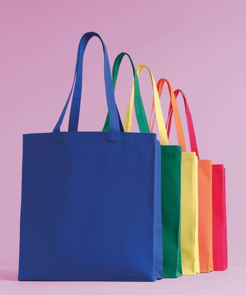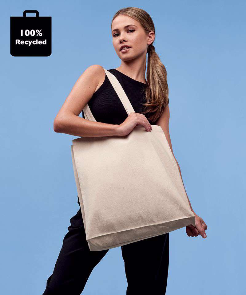 Larger-capacity bag with three side gussets. Made with recycled cotton, it can be carried over the shoulder or by hand. 280gsm weight. Handles measure 35cm x 3cm.