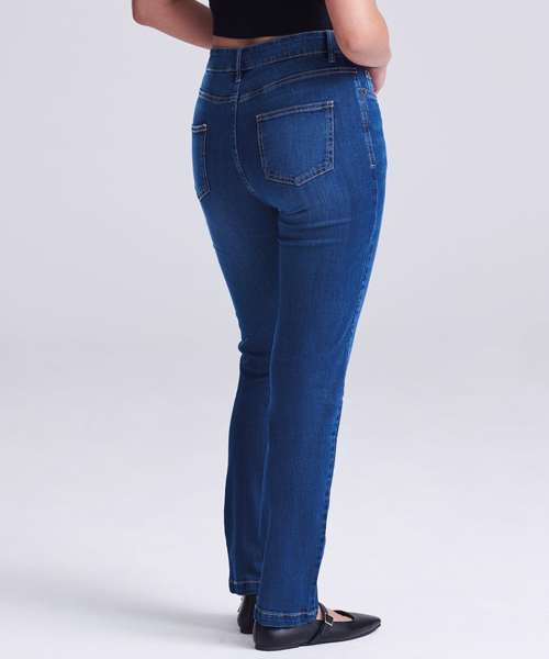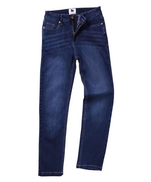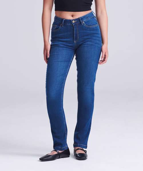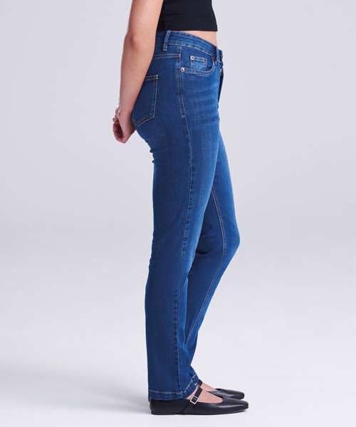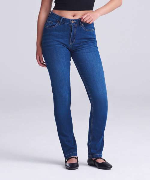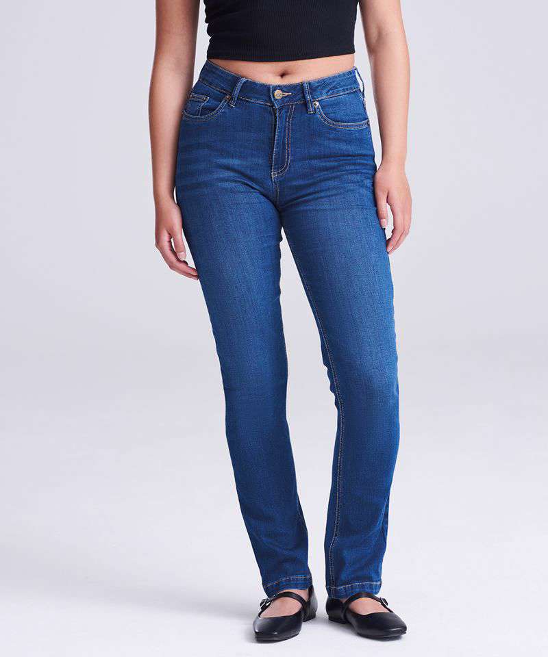 Straight fit. Stretch denim. 5 pocket styling. Light blasting and whiskering (blue washes only). Self-fabric belt loops. Shank button and YKK zip fly fastening. Metal rivet detail at pocket corners. Twin needle stitching detail.
