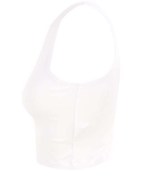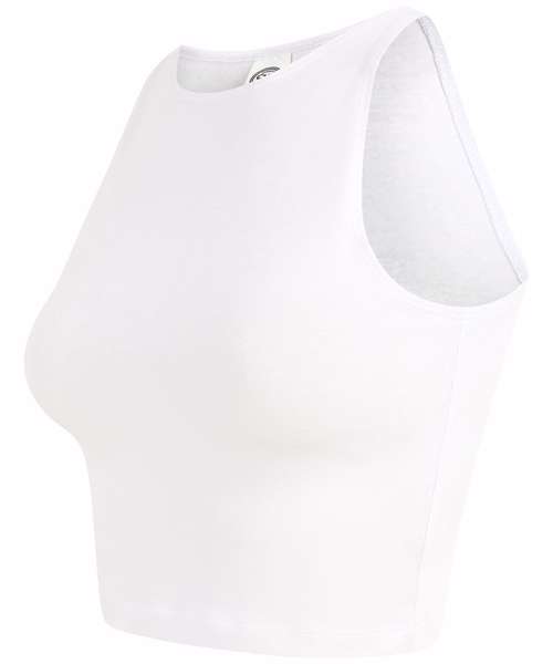 Women's cropped top with racer shape on front and back on neckline. Twin-needle stitching on hem, armholes and neckline. Cropped length. Tear-out label.