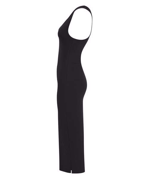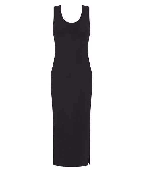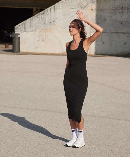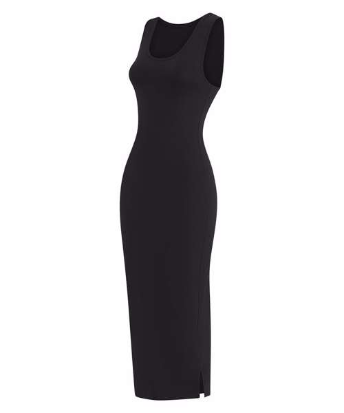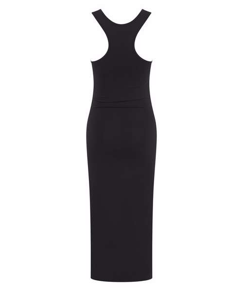 Racerback midi dress. Self-fabric binding at neck and armhole. Side split on left-hand seam (as worn) for easy movement. Twin-needle stitching on hem. Tear-out label for easy rebranding.