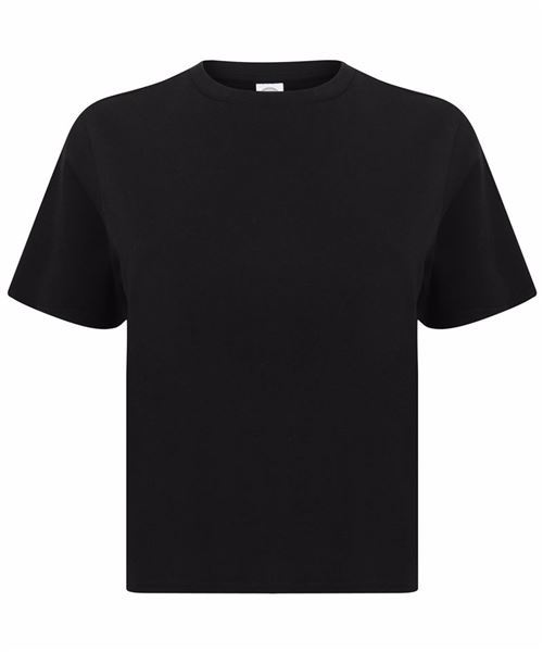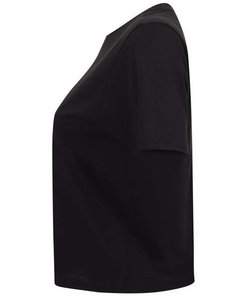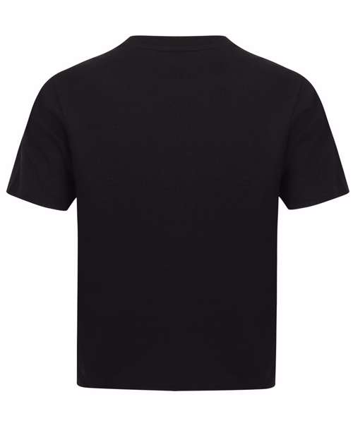 Tear-out label. Cropped T with oversized, boxy fit. Stretch ribbed neckline. Twin-needle stitching. SEDEX certified. Oeko-Tex certified. BSCI certified. Vegan certified.