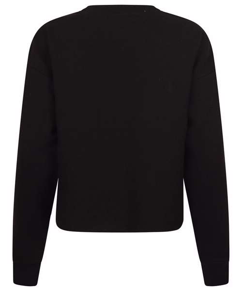 Tear-out label. Oversized sweat with cropped raw hem. Set-in sleeves, with dropped shoulders. 2x2 ribbed neck and cuffs. Single Jersey back neck tape.