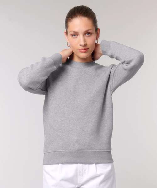 Set-in sleeve. 1x1 rib at neck collar, sleeve hem and bottom hem. Inside herringbone back neck tape. Self-fabric half-moon at back neck. Single-needle topstitch at neck collar. Armhole, sleeve hem and bottom hem with twin-needle topstitch. Unisex, medium fit, long sleeve, round-neck. 85% organic ringspun combed cotton, 15% recycled polyester. Brushed sweatshirt. Fabric washed, light sueded.