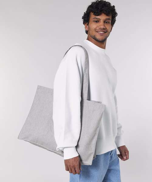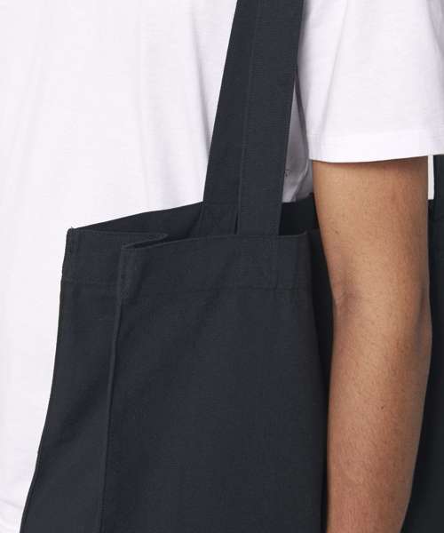 The woven shopping bag is cut in premium 300gsm 80% reclaimed cotton, 20% recycled polyester and features clean and reinforcing finishes.