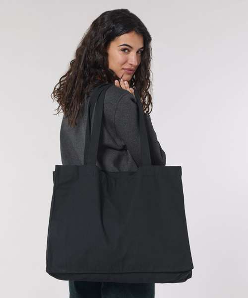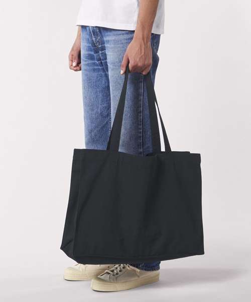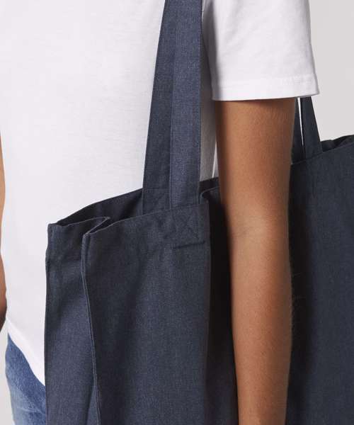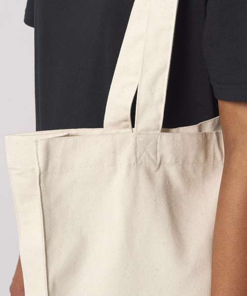 Top edge double folded for strength and clean finish. Side soufflet. Long handles with reinforced cross stitch. Single edge stitch on all seams in matching body colour thread. Unisex. 80% recycled cotton, 20% recycled polyester. Canvas.