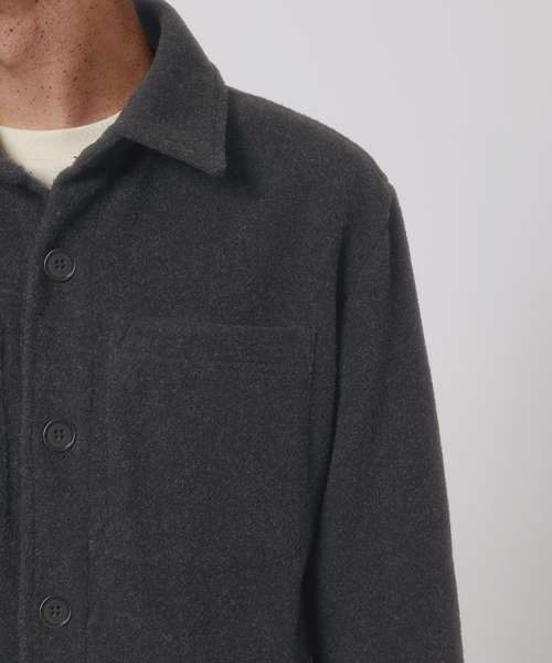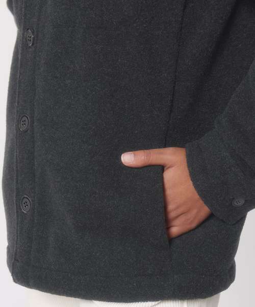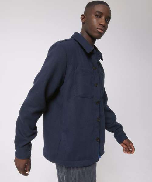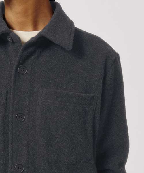 Unisex, unlined shirt jacket. Set-in sleeve. Self-fabric collar with collar stand. Button-down front placket with one button on sleeve cuff. Chest pockets and side seam pockets on both sides. Inside hanger loop in grosgrain tape. Spare buttons attached on inside seam.