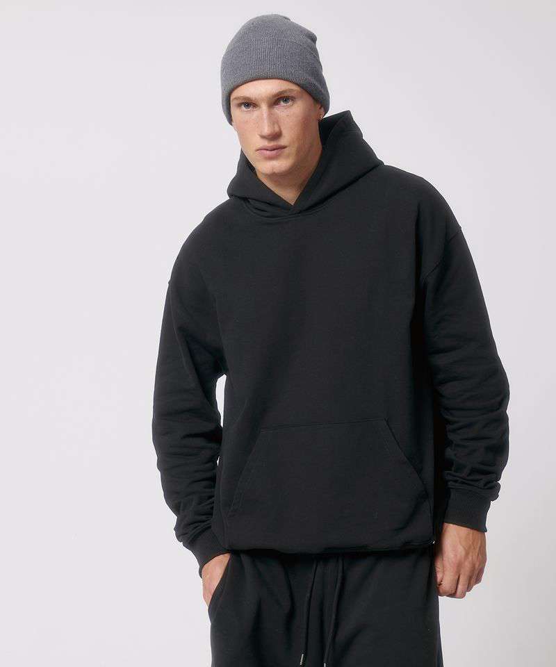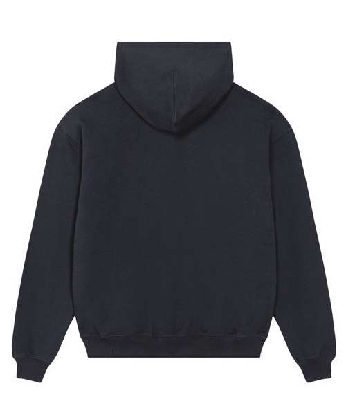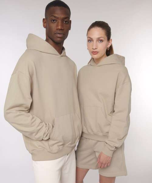 Unisex boxy dry hand-feel hoodie sweatshirt. Set-in sleeve. Double-layered hood in self-fabric. Inside single Jersey back neck tape. Self-fabric half-moon at back neck. Single needle topstitch at neckline and along hood opening. 2x1 rib at sleeve hem and bottom hem. Armhole, sleeve hem and bottom hem with twin-needle topstitch. Kangaroo pocket at front.