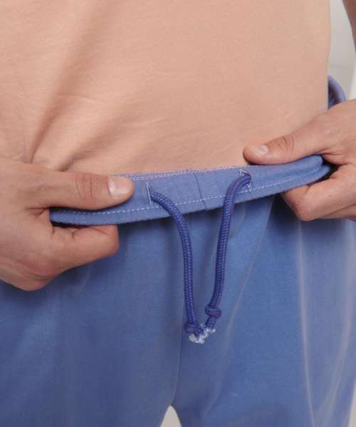 Unisex lightweight shorts. Self-fabric elastic waistband. Hidden flat drawcords on inside waistband. Pockets at front. Patch pocket at back. Bottom hem with narrow double-needle topstitch.