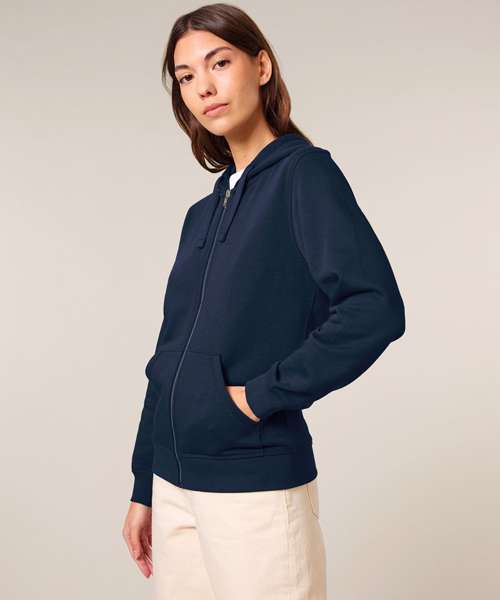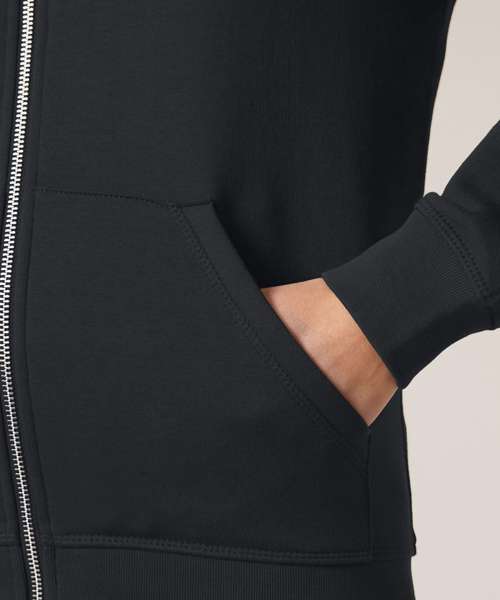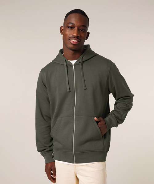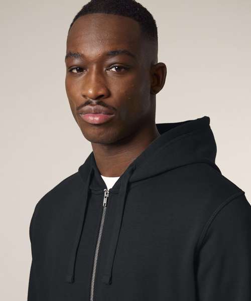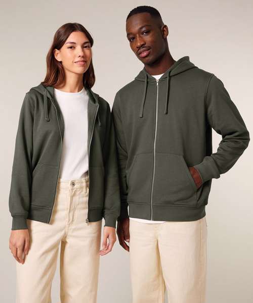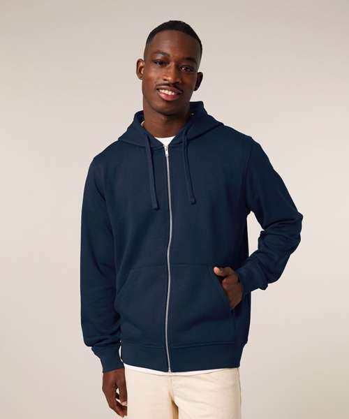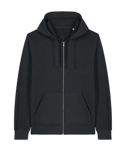 Premium, unisex, mid-light, zip-through hoodie sweatshirt in 280gsm brushed 85% organic cotton and 15% recycled polyester. Medium fit. Excellent printability.
