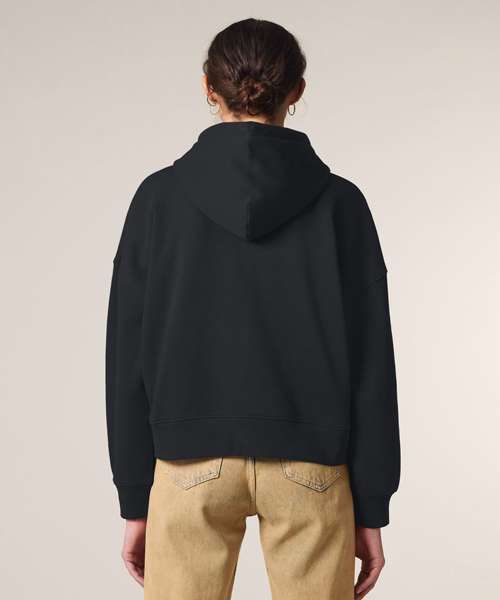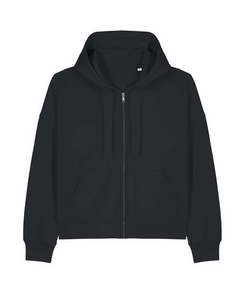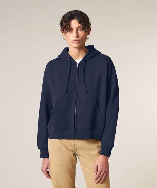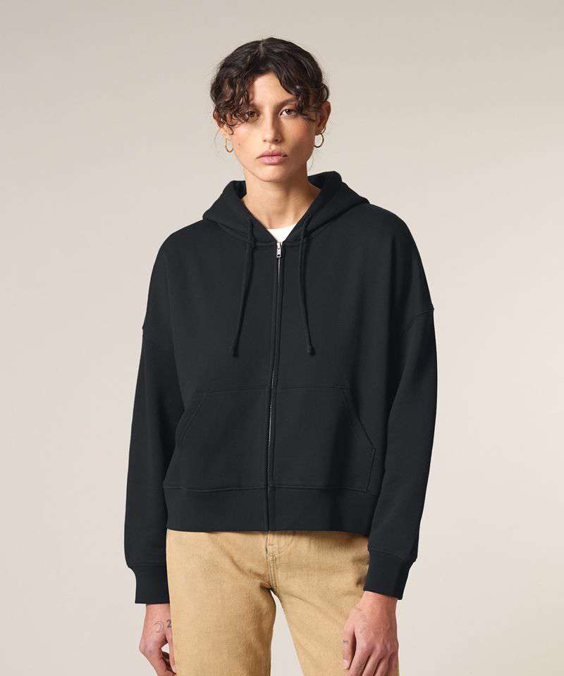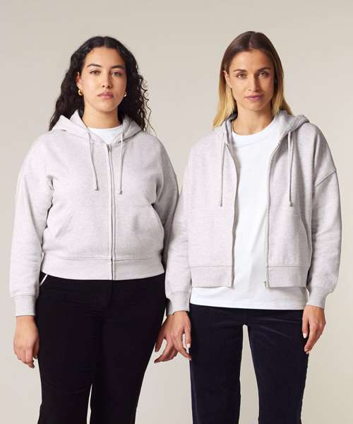 Premium women’s zip-through hoodie sweatshirt in brushed 100% organic cotton, 300gsm. Dropped shoulders, adjusted length. Excellent printability.