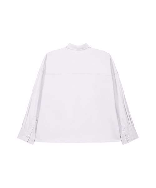 Women’s boxy shirt. Shirt collar with collar stand. Grown-on placket with single-needle topstitching on each side. Back yoke with twin-needle stitching. Forwarded shoulder seam with twin-needle stitching. Dropped shoulders. Square cuffs with single-button opening. Cuff placket with button opening. Shaped hem with side vents. Dipped back panel. Double pleats at cuff. Contains 100% certified organic cotton.