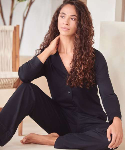 Slip into pure comfort with the beautifully crafted Supersoft pyjamas designed for those who appreciate a little luxury in their loungewear. Made from 100% recycled polyester this set not only feels incredible against the skin – it’s also kind to the planet. The long-sleeve shirt top features a classic lapel collar with elegant pearlised buttons running down the front enhanced by refined contrast piping along the collar cuffs and hem for a timeless finish. A grown-on button stand adds a seamless tailored touch while the back neck tape ensures durability and extra comfort. The matching trousers are all about relaxed ease with an elasticated waistband and adjustable drawcord that offer the perfect fit every time. The set is tag-free for easy rebranding and combines elevated styling with everyday comfort making it the ideal addition to any loungewear or sleepwear offering.
