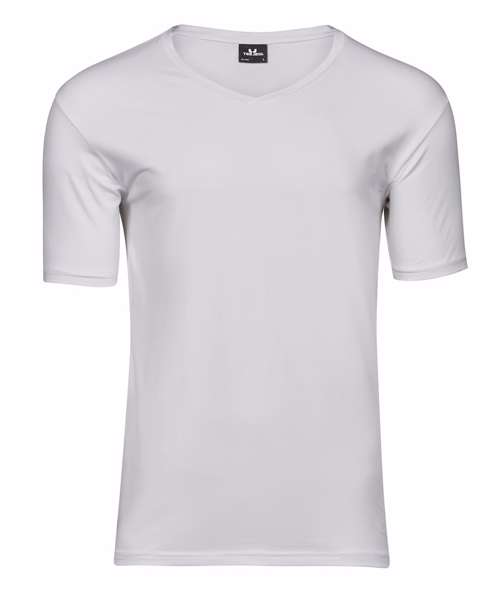 The slim-fitted Stretch v-neck tee features a two-layer slim neck rib and reinforced shoulders.