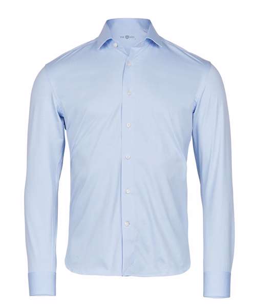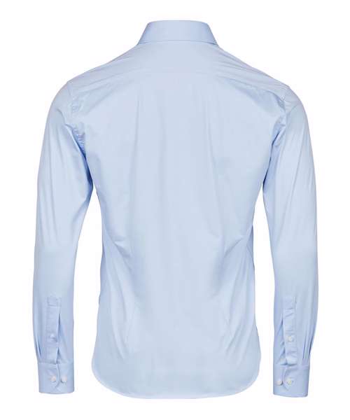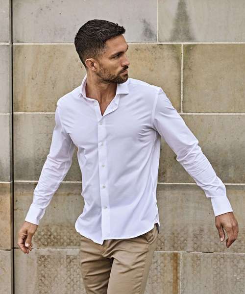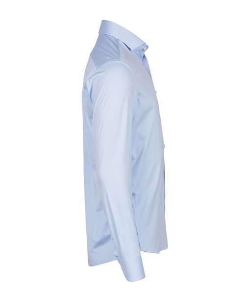 Four-way stretch. Wide spread collar. Shaped fit. Modern-shaped cuffs. Back yoke. Easycare. Ascolite button wrapping.