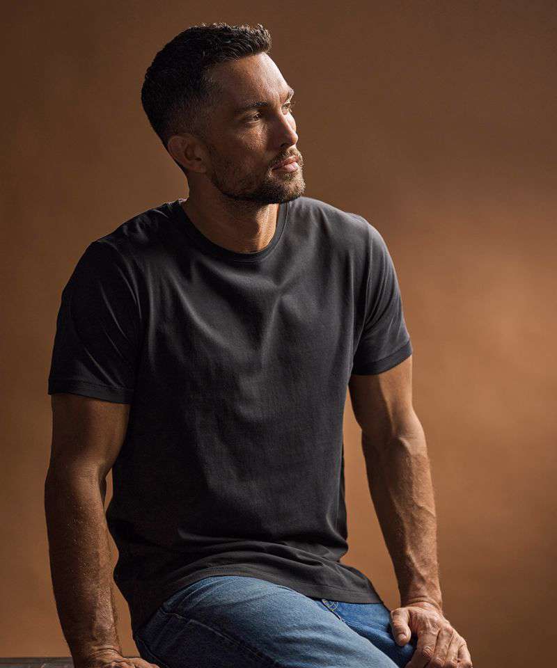 Tailored fit. Shoulder-to-shoulder neck tape. Double pre-shrunk. Double stitched. Long-fibre cotton. Enzyme-washed. Silicone treatment. Certified organic cotton.