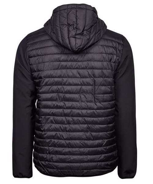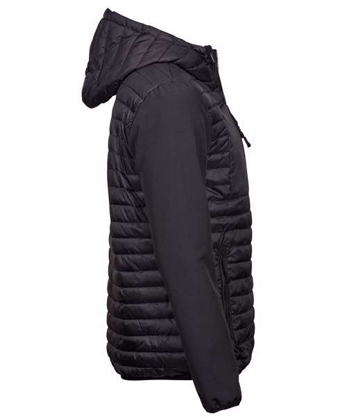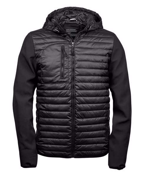The cool Hooded crossover jacket features stunning detailing such as a chest pocket with zip and an adjustable hood, making it both practical and fashionable. For a sporty look, it combines a light polyester 300T with padding and softshell. The jacket has an adjustable hem, elastic cuffs, two side pockets and an inner pocket.