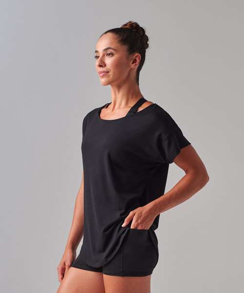 Women's scoop neck T with oversized fit and scoop neck. Dropped shoulder seams and dropped tail hem on back. Super soft fabric. Tear-out label.