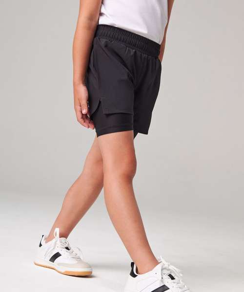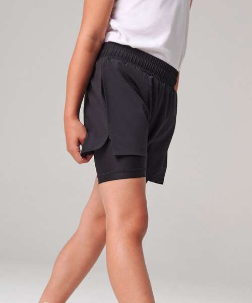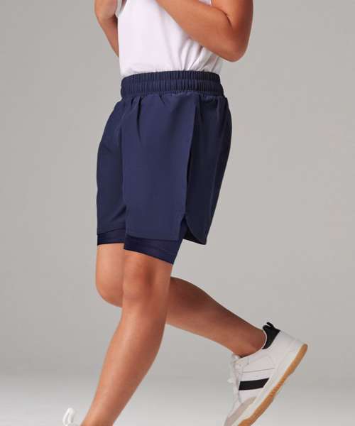 Double-layer sports shorts for kids, made with four-way stretch microfibre fabric.