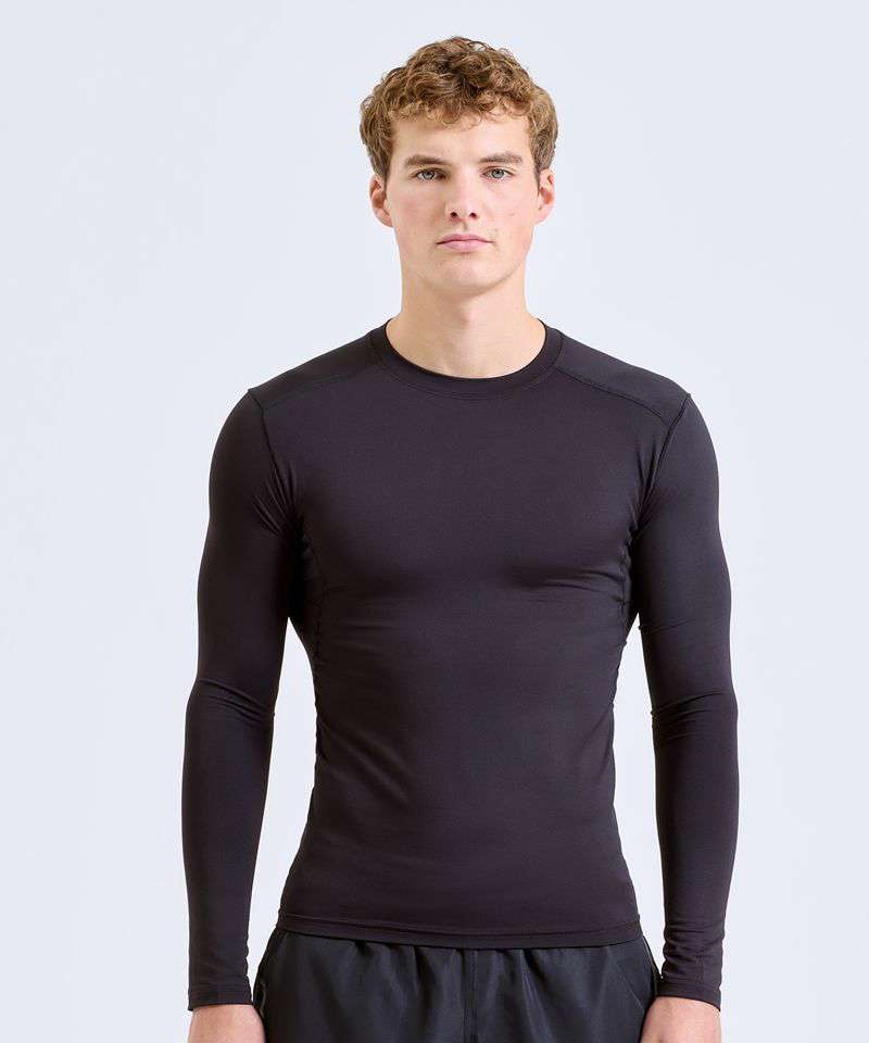 Stretch. Crew neck. Long sleeve. Lightweight. Twin-needle stitching on hem and arms. We recommend using block out vinyl and inks.Product contains no branded neck or waist label. Removable Kimble or looped garment tags. Inner seam label holds important product information on one label with a second label containing brand information which can be cut-away. UPF 40+.