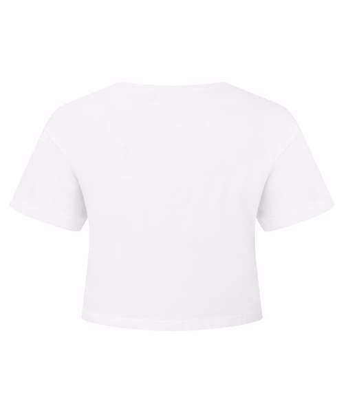 Cropped t-shirt. Short sleeve. Crew neck. Soft-feel. We recommend using block out vinyl and inks.Product contains no branded neck or waist label. Removable Kimble or looped garment tags. Inner seam label holds important product information on one label with a second label containing brand information which can be cut-away.