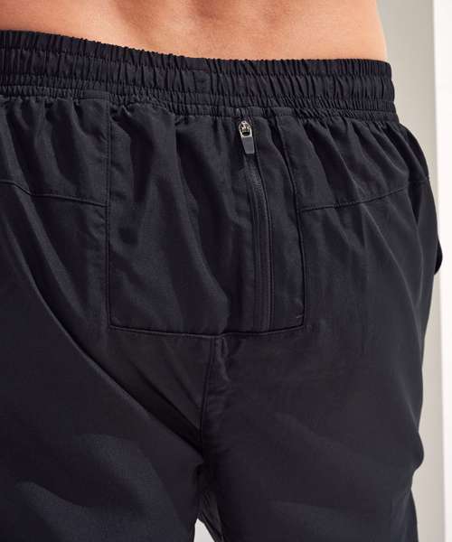 Wicking fabric. Elasticated waist with drawcord inner. Inner liner shorts for support. Mid-thigh length. Lightweight. Zip pocket to back for storing essentials. Two front pockets. Drop hem detailing to front of shorts, whilst a drop hem to the front of the shorts adds a unique twist. Inside leg- 16.5cm. We recommend using block out vinyl and inks.Product contains no branded neck or waist label. Removable Kimble or looped garment tags. Inner seam label holds important product information on one label with a second label containing brand information which can be cut-away.