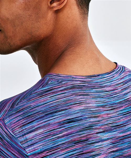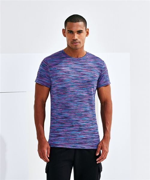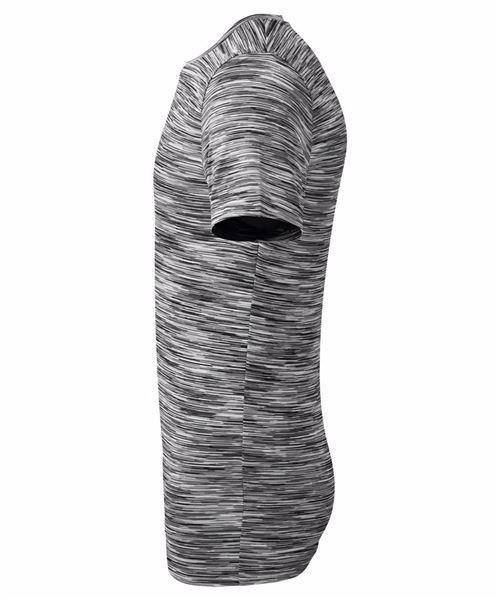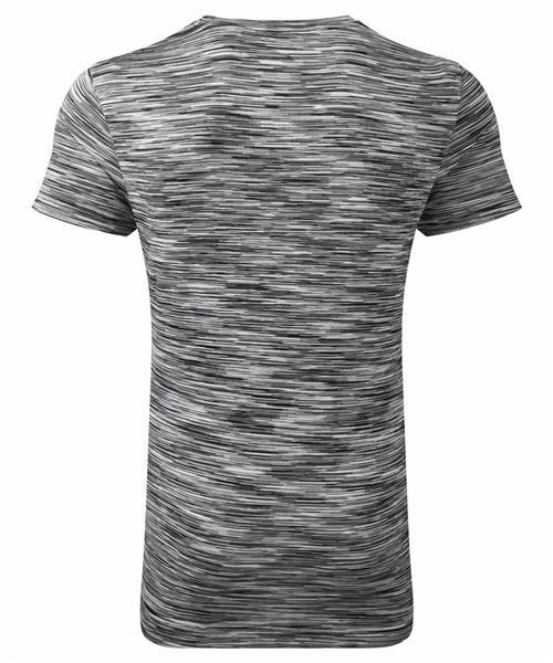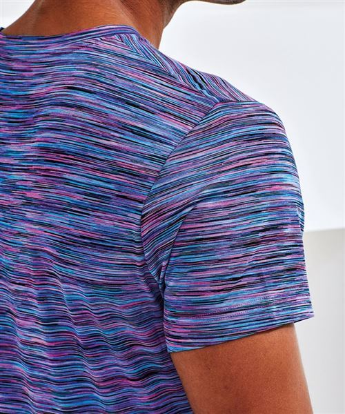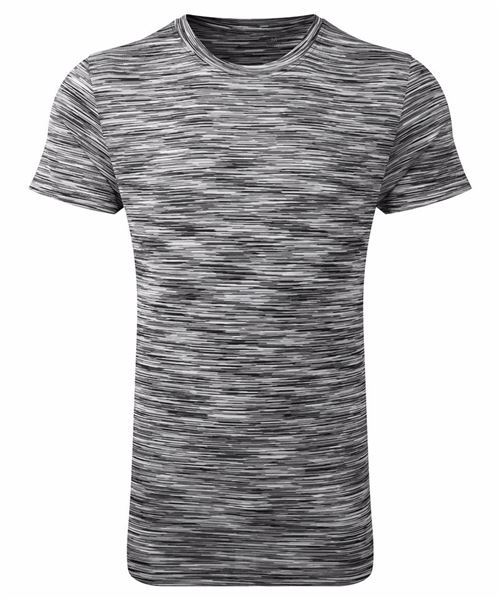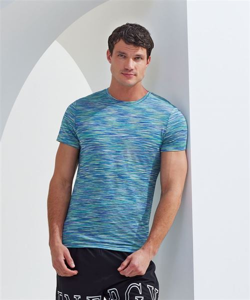 Wicking fabric. Stretch. Crew neck. Short sleeve. Lightweight. Twin-needle stitching on hem and arms. Slight stretch due to elastane blend. Space dyeing/yarn printing is a technique which gives yarn a unique, multicoloured effect. We recommend using block out vinyl and inks.Product contains no branded neck or waist label. Removable Kimble or looped garment tags. Inner seam label holds important product information on one label with a second label containing brand information which can be cut-away. UPF 40+.