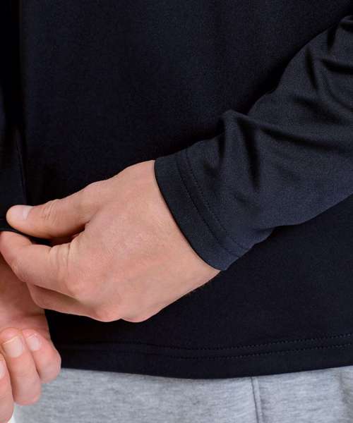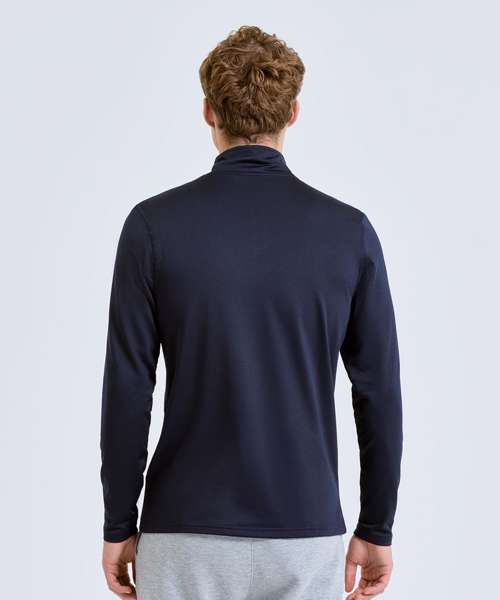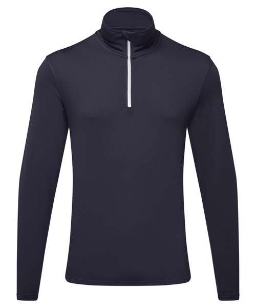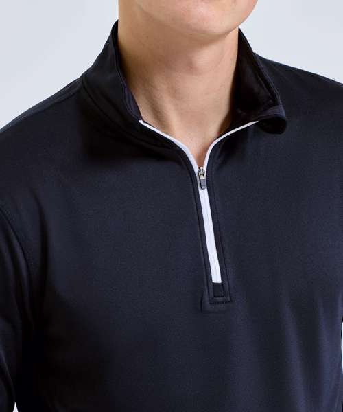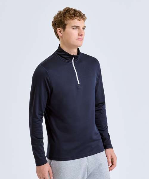 ¼ zip design. Long sleeves. Stretch. Recycled polyester. Wicking fabric. Brushed inner. The product contains no branded neck or waist label. Removable kimble or looped garment tags. The inner seam label holds important product information on one label with a second label containing brand information which can be cut-away. We recommend using block out vinyl and inks.