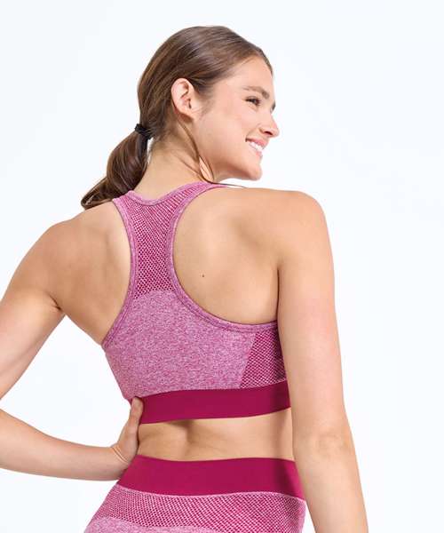 Seamless sports bra. Contrast grown on waistband. Wicking fabric. Body sculpting design detailing. Medium impact. We recommend using block out vinyl and inks.Product contains no branded neck or waist label. Removable Kimble or looped garment tags. Inner seam label holds important product information on one label with a second label containing brand information which can be cut-away.