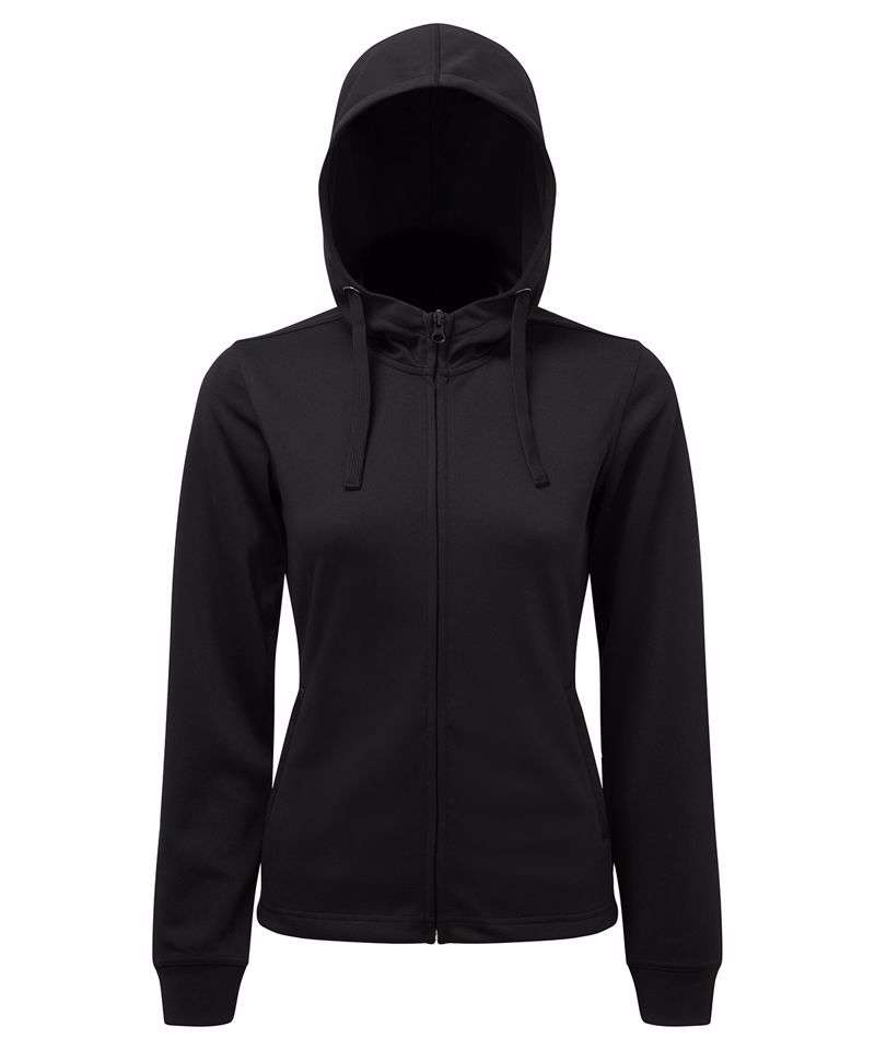 Hooded jacket with chin guard. Full zip-through. Concealed centre zip and zip pockets. Drawstring cord fastenings to hood with chrome eyelets. Double-panelled hood. Feminine fit. Cuffed sleeves. Made with recycled polyester, Spun dyed technology. Spun dye melts colour pigments and recycled polyester together, creating coloured fibres using fewer chemicals, less water and less CO2. Spun dye fabric also improves the colour-fastness of garments. We recommend using block out vinyl and inks.Product contains no branded neck or waist label. Removable Kimble or looped garment tags. Inner seam label holds important product information on one label with a second label containing brand information which can be cut-away.