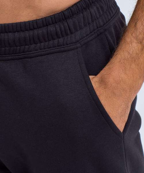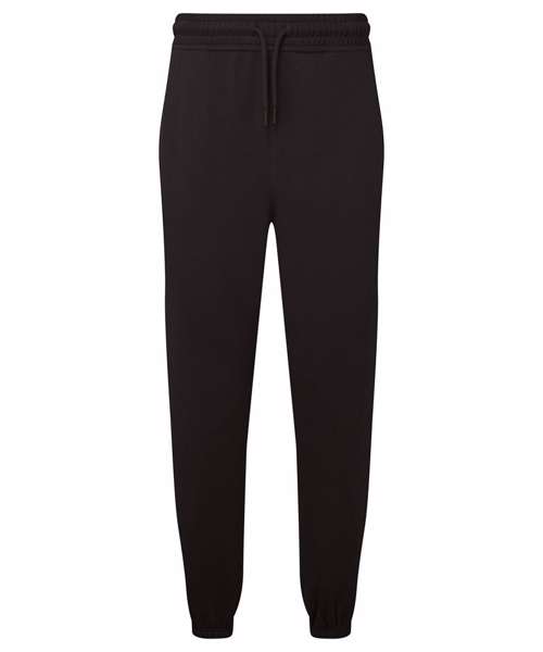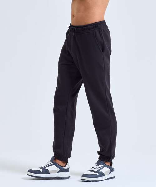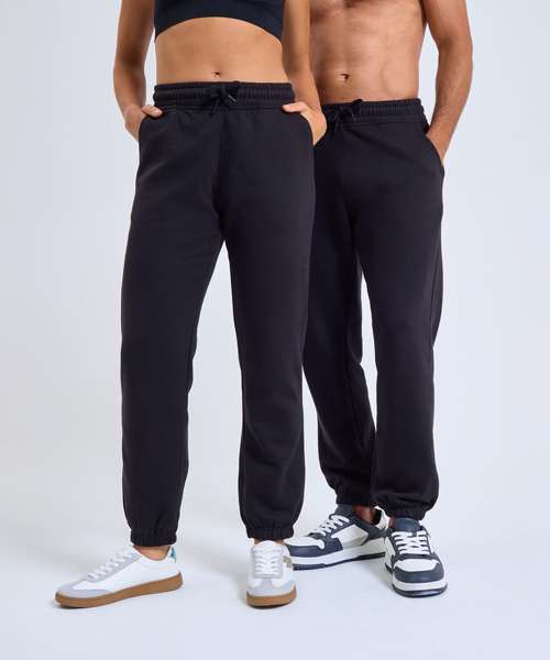 Soft-feel joggers. Unisex style. Relaxed loose fit. Inner brushed fleece. Recycled polyester. Elasticated waistband and cuffs. Buttonhole stitched eyelets. Cords with painted metal ends.