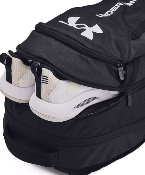 Water-resistant UA Storm technology keeps your essentials dry. Soft-to-the-touch top coat on material for added durability. Soft-lined laptop sleeve – holds up to 16" MacBook Pro or similar-sized laptop. Secondary compartment can be dual-purposed as a shoe/laundry pocket. Secure zip front pocket for essential item storage and side water bottle pocket that accepts 32oz bottle. Molle webbing for additional attachment points. Top grab handle.