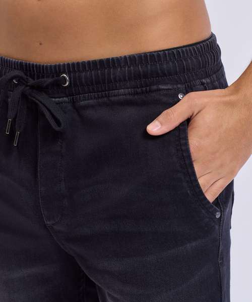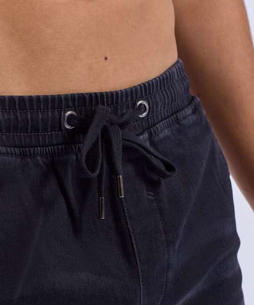 Two swing pockets and two back patch pockets with gunmetal cap detailing. Elasticated waistband with drawstrings. Gunmetal eyelets and caps to drawstrings. Stitched fly detailing. Worn denim effect. Contrast stitching. Shorts can be worn rolled up.