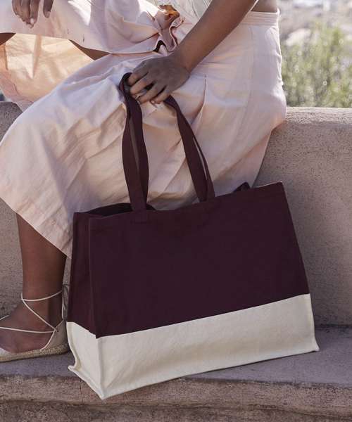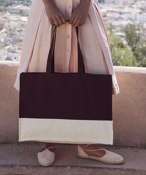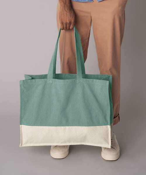 Crinkle wash. Premium heavyweight fabric. Contrast colour panel. Framed stitch detail. Self-fabric carry handles. Can be carried by hand or over the shoulder. CutAway label for ease of rebranding, Made from certified organic fabric.