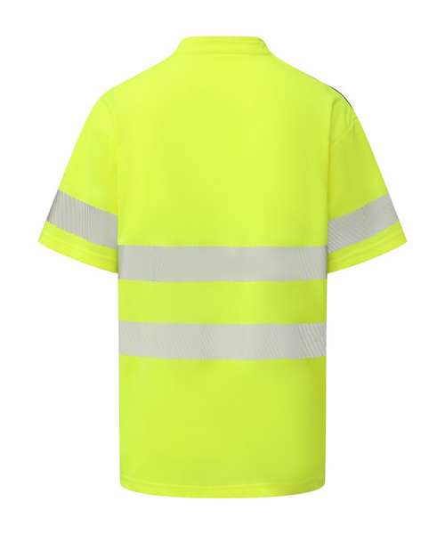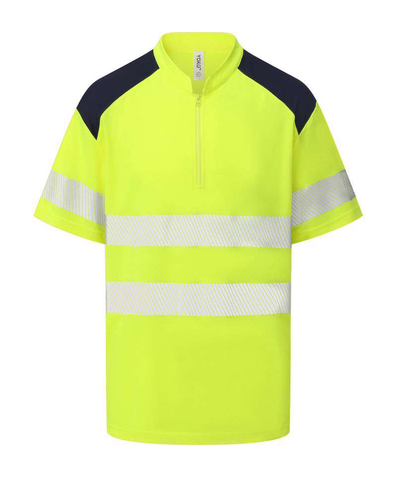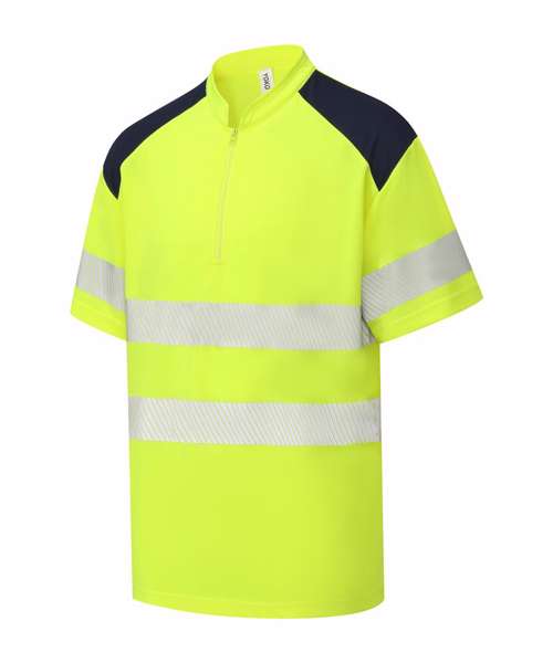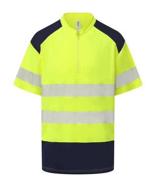 Conforms to EN ISO20471:2013 Class 2. Hi-vis Orange and Hi-vis Orange/Navy also conform to RIS-3279-TOM. Made of premium quality waffle piqué fabric from recycled polyester. Wearer-friendly zip neck with neat mandarin collar. Two 6cm-wide comfort reflective trims are heat-sealed around the body and one over each arm. Contrast navy shoulders. Relaxed fit. Twin-needle stitching. Split hem. Tag-free. Individually packed. Decoration-friendly. UV protection to UPF 40+.