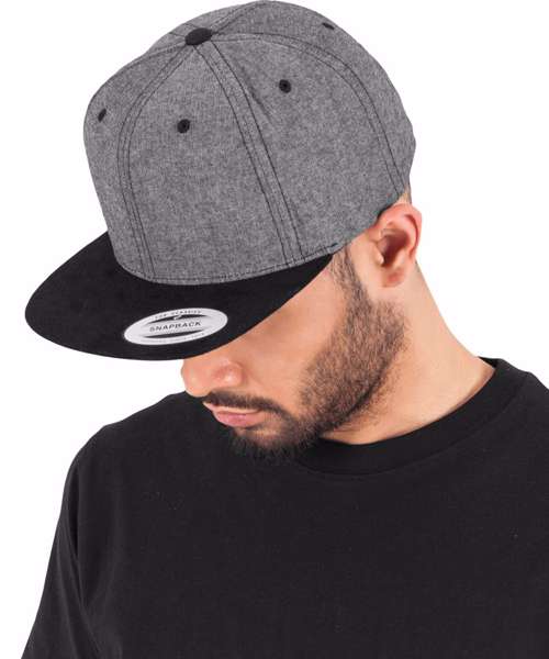 The chambray-suede effect gives this snapback an elevated style. The 6-panel cap with matching under visor features subtle details such as contrast eyelets and button and a tonal plastic snap.