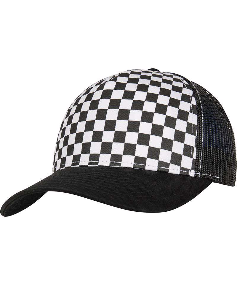 Checkerboard retro trucker cap. Hip checkerboard pattern. Checkerboard print on the front, airy mesh on the back. Integrated snapback closure for easy size adjustment.