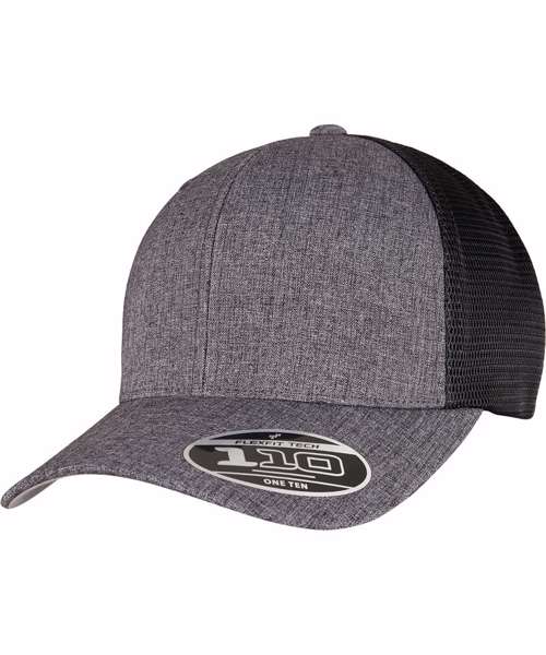 Two-toned trucker cap with adjustable, color-matching snapback closure, made of cotton and polyester, one size fits all, Flexfit 110 technology, 8-fold quilted, pre-bent visor.