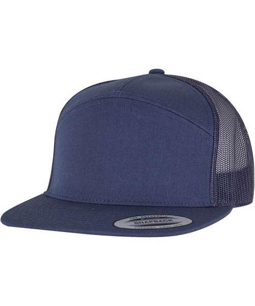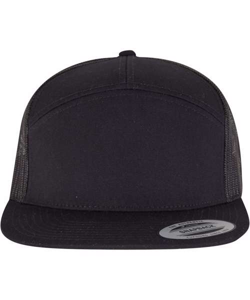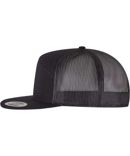 Flat crown with reinforced front. Straight brim. Seamless front. Mesh back. Snapback closure.